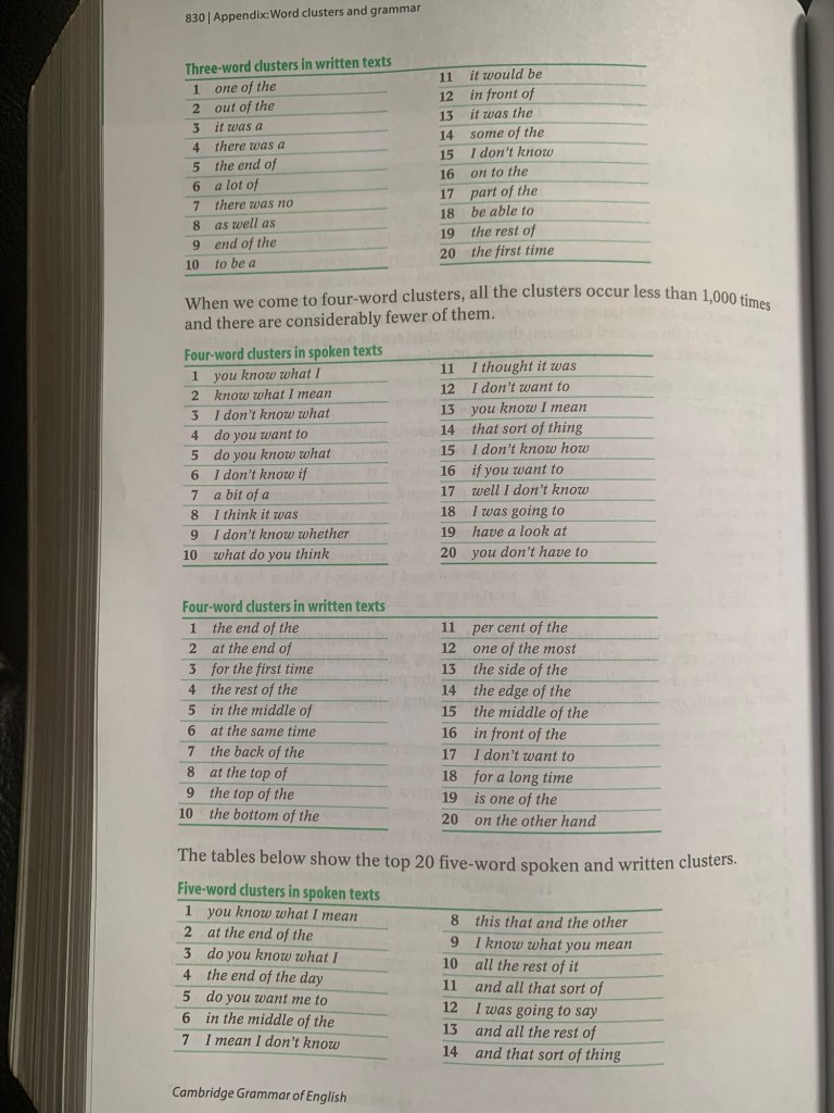 Hasil penelitiannya yang kemudian dirangkum dalam corpus percakapan untuk persiapan menyusun buku Cambridge Grammar of English A Comprehensive Guide Spoken and Written English Grammar and Usage, (Ronald Carter dan Michael McCarthy (Cambridge University Press, 2010), disajikan dalam bentuk cluster mulai dari dua kata, tiga kata, empat kata, dan lima kata.