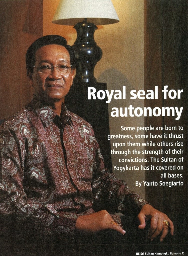 The sultan says Indonesia needs to be united. “There’s still a lot of suspicion. We’re still differentiating on race, ethnicity and origin, ruler or common people, Javanese or Bugis or ethnic-Chinese, religion and so forth. Unless we’re united in perception this nation will not be able to cope with its backwardness and face globalization.”